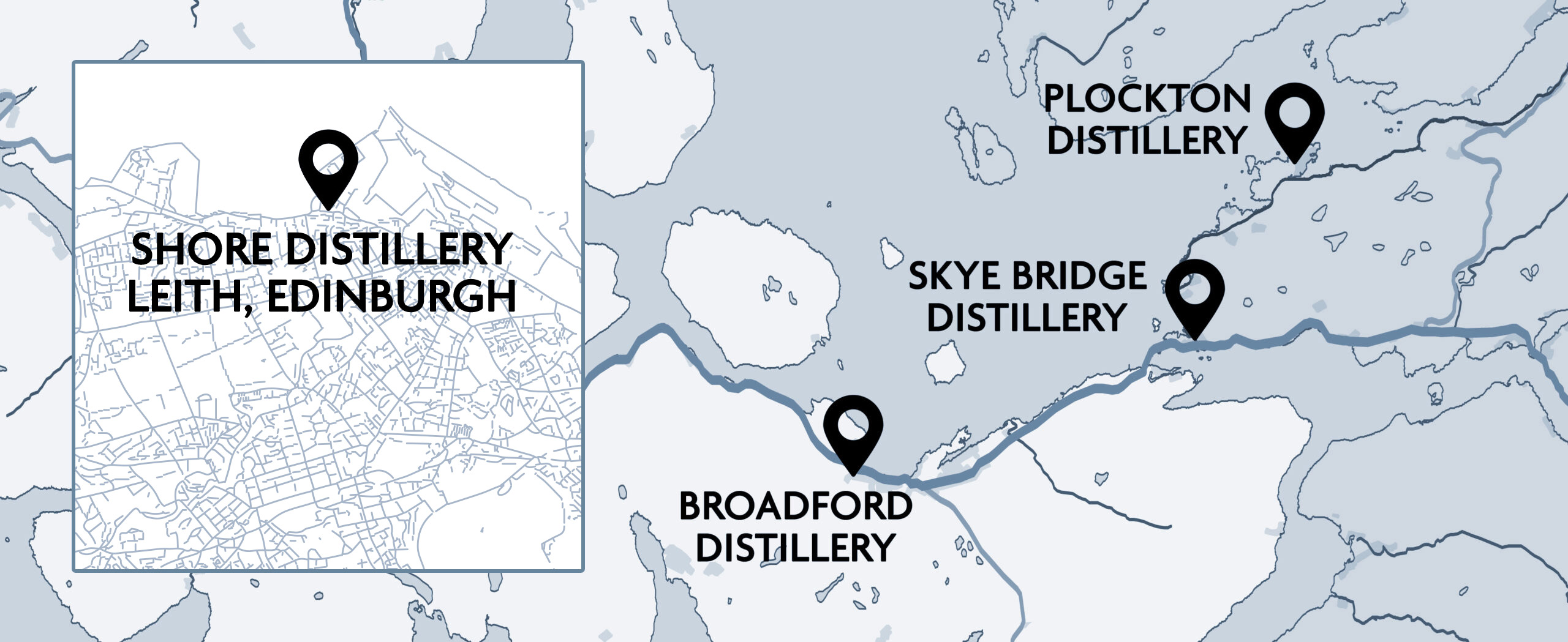 Discover the heart of our craft through our four unique distilleries. Broadford Distillery, rooted in tradition in the bustling heart of Skye; Skye Bridge Distillery, standing proudly at the gateway to the island; Plockton Distillery, nestled in a charming coastal village on the mainland; and the Shore Distillery, in Leith, Edinburgh, bringing the Highlands and the Isle of Skye to the city. Each location brings its own character, landscape, and story to the spirits we create.